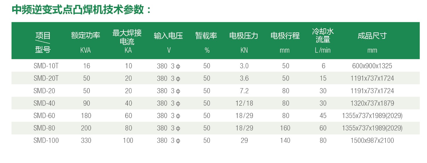 SMD系列中頻逆變式點凸焊機是目前最先進的焊接設備。應用廣泛,焊接變壓器體積小而輸出能量大。因其焊接變壓器頻率由目前市電的